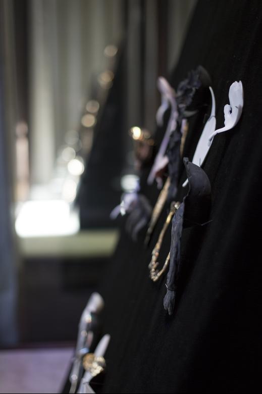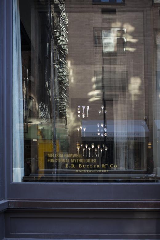 Gamwell uses a sophisticated technical process involving bone china, phosphate dyes, water, and semiprecious metals to create sculptural objects that seductively straddle the line between the fine and applied arts. The result is beautifully disconcerting: fine china and flatware firmly reimagined through the chaotic logic of the natural world.
